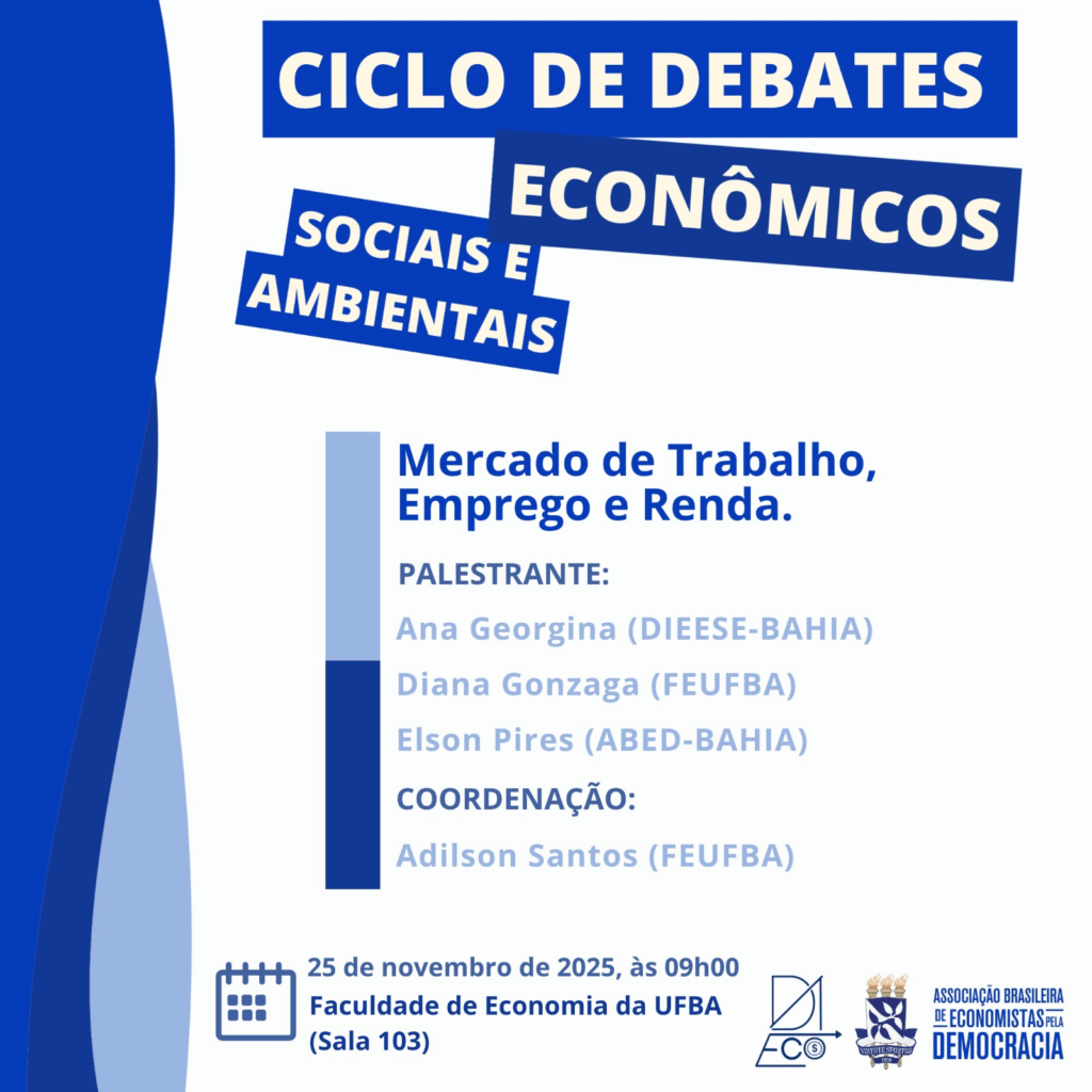 No dia 25 de novembro de 2025, às 09h00, na sala 103 (Primeiro Andar) da Faculdade de Economia UFBA, a ABED-Bahia promoverá a segunda mesa do Ciclo de Debates Econômicos, Sociais e Ambientais, abrindo espaço para uma discussão fundamental para o desenvolvimento baiano e brasileiro: Mercado de Trabalho, Emprego e Renda. O encontro reforça o compromisso da entidade em promover diálogos qualificados, multidisciplinares e voltados à compreensão das transformações estruturais que moldam a dinâmica socioeconômica e ambiental do país.